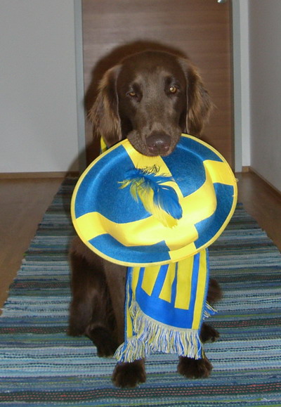 Ikväll var vi kvar i stan och tittade på svenskar. Jag tror nog att Russin var den hund som blev mest fotograferad. Jag hade knytit den svenska halsduken om halsen på henne och alla tyckte att hon var så söt. Själv tyckte hon det var lite kul i början för det var ju många som hon kunde pussa, men de ville ju klappa henne oxå och eftersom hon inte gillar det så mycket tyckte hon att det blev lite jobbigt efter ett tag.