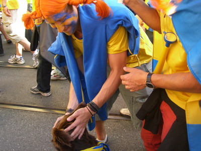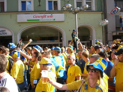 Alla här är förtjusta över de svenska fansen som är otroligt organiserade. Visst är det en del som har druckit lite mycket, men alla är glada och det är inget bråk eller förstörelse. Det var fantastiskt att se denna marschen som tågade igenom Innsbrucks gator. Nu hoppas jag bara att Sverige vänder på spelet och vinner över Ryssland i den andra halvleken. Vi håller fortfarande tummar och tassar.