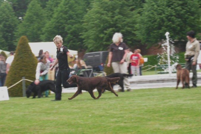 Vi åkte tidigt på torsdagsmorgon och hade en resa på ca 3 1/2. Det var rätt så lite trafik och vi kom fram i god tid. Tillställningen öppnades klockan halv tio i Stift Melks trädgårdanläggningar. Det var väldigt många flattar som var anmälda. Vi fick ett mycket bra resultat med en tredje placering och excellent i tikarnas öppenklass. Russin fäller i massor och jag tänkte ett tag att jag skulle hoppa över utställningen. Domare var Jos de Cuyper (B). Han tyckte naturligtvis inte heller att pälsen var i ”condition” men sa till mig att hon rör sig fantastiskt, helt fantastiskt och det blev jag otroligt glad över. På hemsidan har jag hennes kritik!