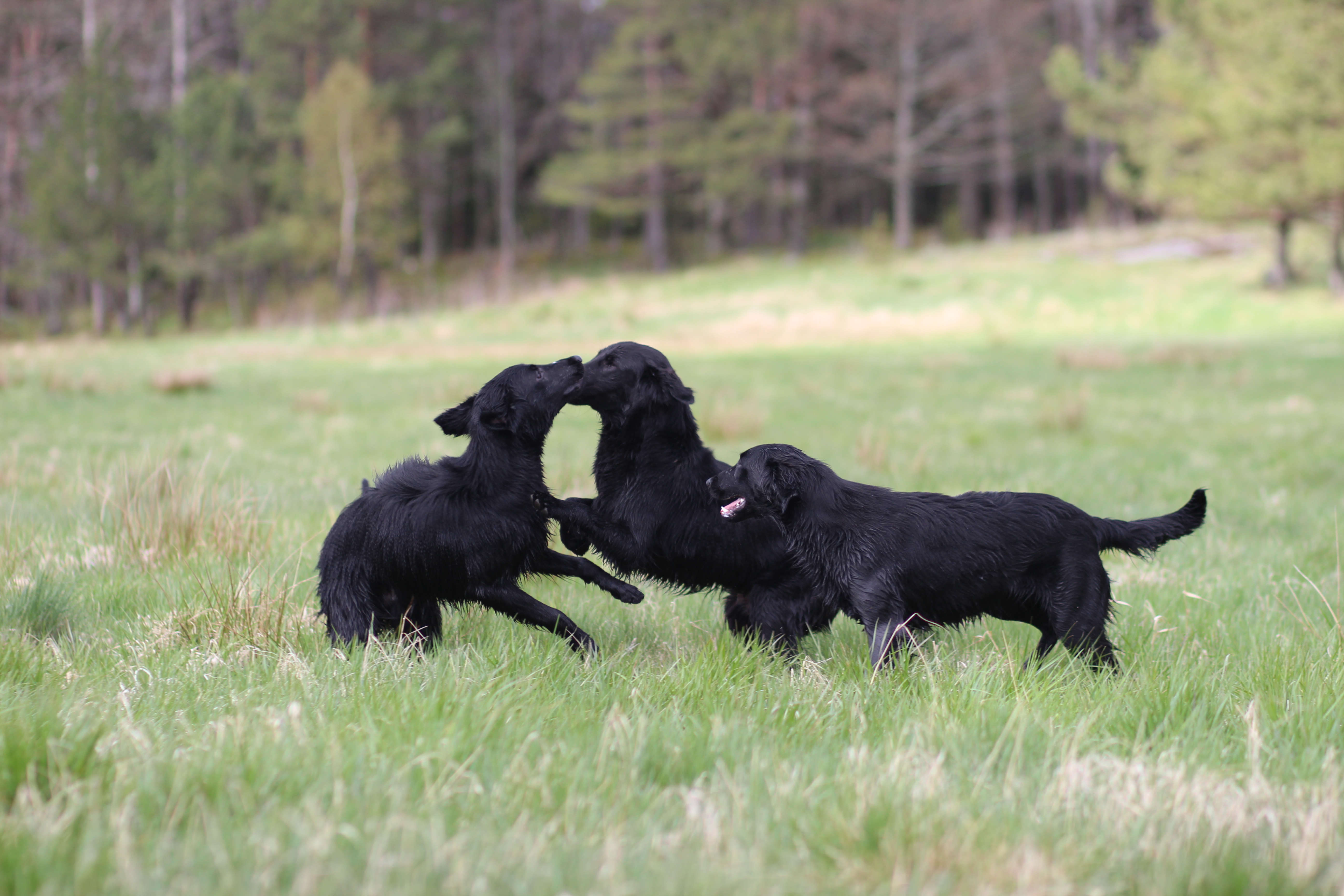 Tidigt på söndagen åkte vi upp till Lerum för att träffa Peppars syskon. Vi var där redan straxt före halv tio och Therese väntade redan på oss. Olaf skulle komma lite senare så vi började med Peppar som spelade clown rätt så mycket. Jag fick några riktigt bra tipps av Therese som vi ska prova för att komma vidare. När vi sedan provade på vilt tog jag fram spårlinan och hade honom kopplad så att han inte skulle sticka ifrån oss. Ingen tvekan alls med viltet, det kvittade om det var kaja, kricka, kanin eller trut. Allt tog han upp utan att tveka. Härligt att se. Efter det visade Therese upp fina Loka. En härlig liten tik och redan riktigt duktig. Sen kom Olaf med matte och husse. Han fick också börja som Peppar och jag gjorde. Duktig var han också, lite större och kraftigare än Peppar och lite lydigare 😉 Vi åt lunchen ute, en god kyckling/pasta sallad som Therese gjort och efter det la vi var sitt viltspår. Jag la ett lite längre till Peppar med två vinklar. Det fick inte ligga så länge, men Peppar gick det riktigt, riktigt bra, så det blir väl kanske att vi startar anlagsklassen till sommaren när vi åker upp till Sverige nästa gång. När vi var klara fick även Olaf prova vilt. Han var inte riktigt lika spontan som Peppar, men tog allt så småning om. Vi märkte att de började bli lite trötta så vi avslutade med hopp och lek för alla tre och mamma Whimsie. En härlig och rolig dag som tyvärr var väldigt kall.