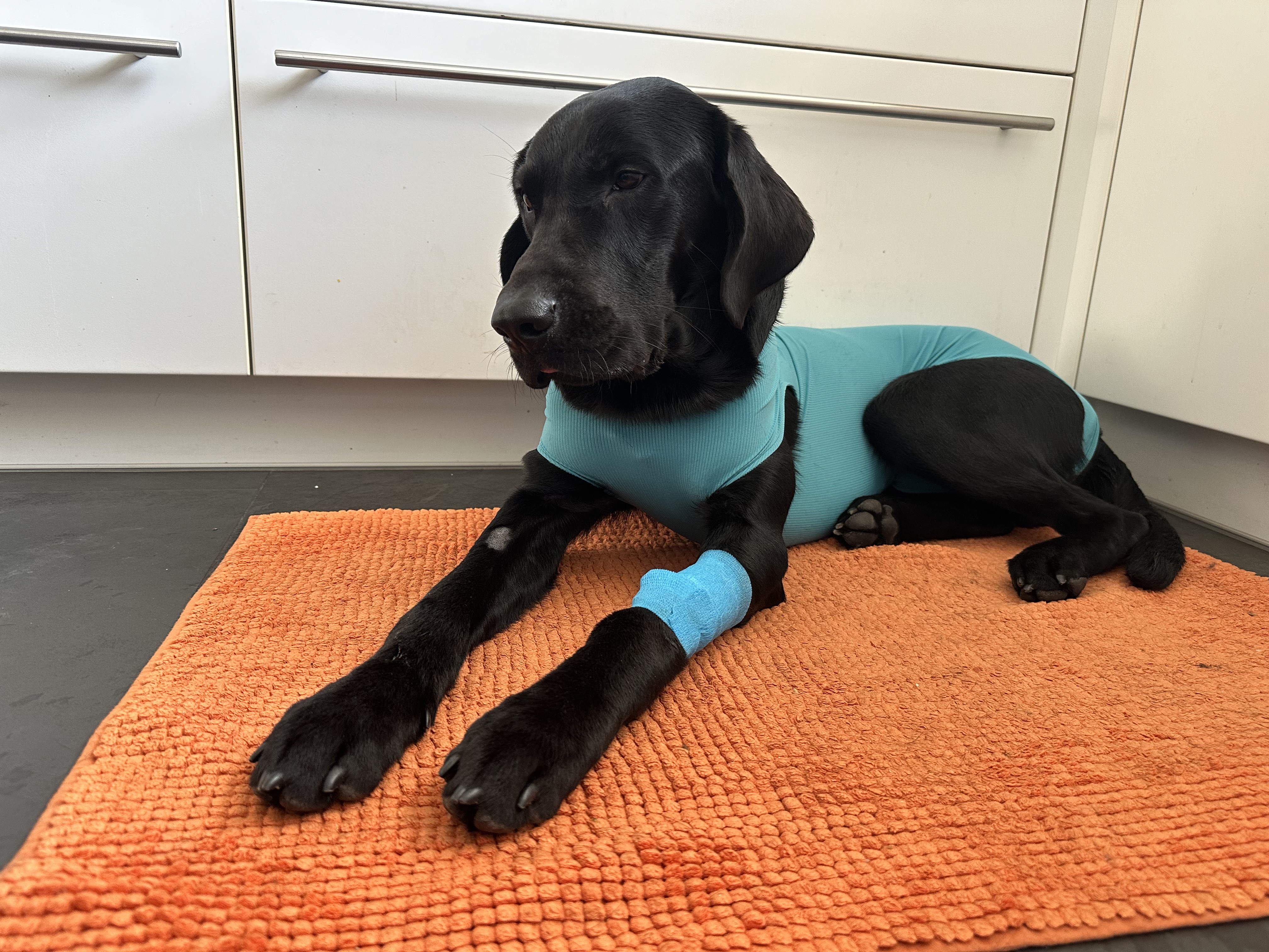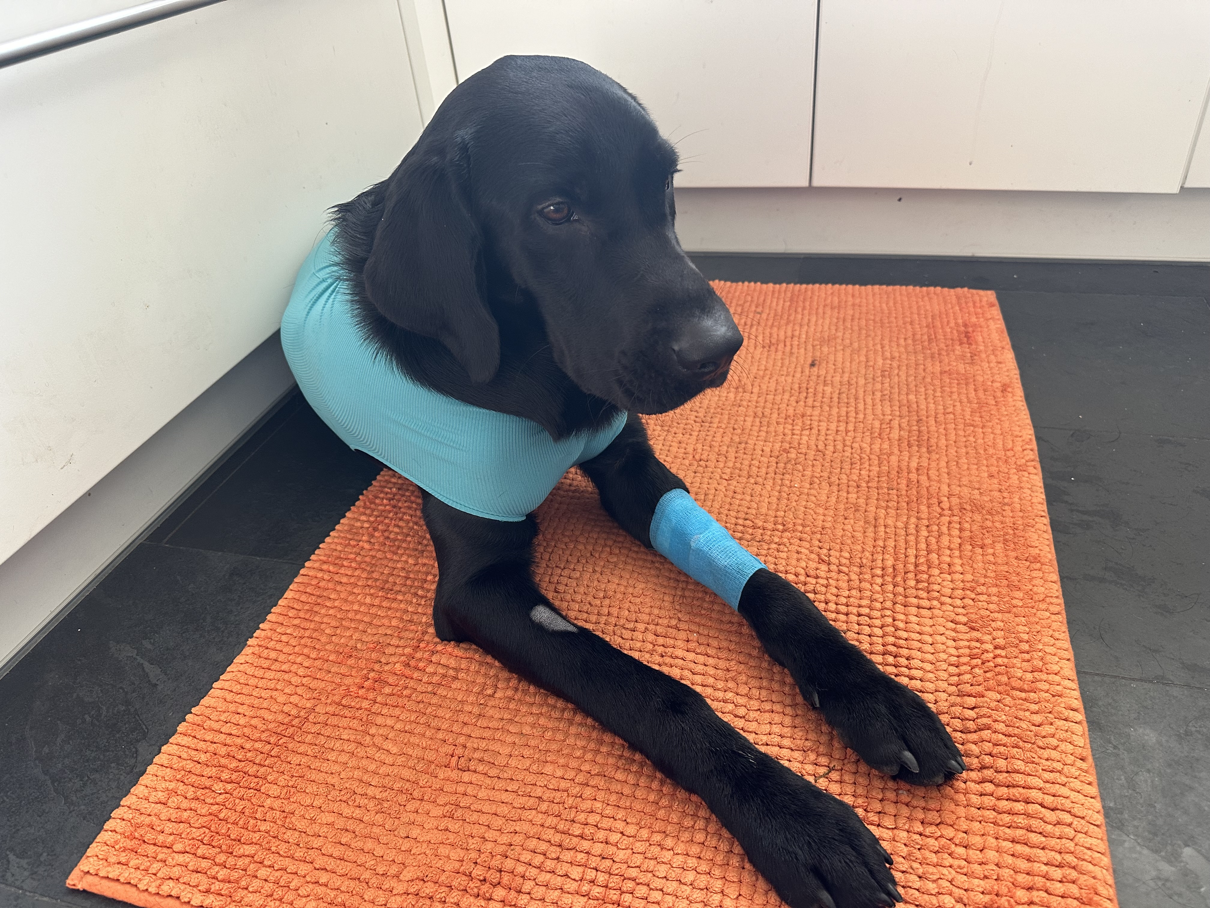Darran fick ont i magen under dagen, kräktes och mådde inte bra. Vi trodde att det var något tillfälligt, men fram mot kvällen blev det värre och han kräkte blod och det luktade avföring. Vi körde till veterinären där han blev röntgad, men man såg egentligen ingenting. Han fick dropp och mediciner och verkade må bättre, men på natten vid halv tre kräktes han igen och han låg och gnällde så jag ringde veterinären igen. Vi skulle komma vi sex tiden på morgonen den 1.1.2024 och då blev det operation på en gång och man plockade ut en liten bit majs som hade satt stopp i tarmen. Alltså Tarmvred! Stackars lille Darran!