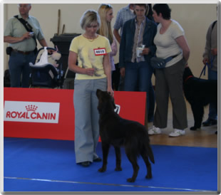 04.11.06 Den första utställningen. Vi är ju egentligen inte kloka som kör så långt. Men jag ville prova att ställa ut Russin så snabbt som möjligt och då var 38 mil för en sträcka inte för långt. Jag måste verkligen tacka Arthur för att han ställde upp, för i början verkade det inte så. Men hellre så än att jag körde själv tyckte han. Russin var lite rädd i början när vi gick in. Det var ju otroligt många hundar och som dessutom skällde. Men sedan gick det bra. Hon ville naturligtvis hälsa på många men blev rätt så lugn efter ett tag. Eftersom det var den första utställningen för båda, var jag lite nervös även om det försvann med en gång vi kom in i ringen. Jag vet att Russin är jättefin och i Babyklassen behöver ju inte allt vara perfekt. Domaren var också förtjust, så naturligtvis gick allt bra. Det var iaf jättekul att vara med och nästa utställning blir i Wels den 2.12.2006