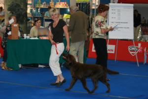 Då har det varit utställning igen. Det gick bra denna gången också, även om lilla Russin kanske kände av att matte var lite mer nervös. Hon stog inte så länge fint och när vi skulle springa hoppade hon några gånger. Det var tre tikar i hennes klass och två fick betyget mycket lovande och den tredje lovande. Det hela var väldigt snabbt avklarat eftersom domaren hade 26 flattar, 44 labbar, 3 curly och 2 tollare att döma. I Stuttgart hade domaren bara 25 flattar och hon var sysselsatt med dem hela dagen. Så här efteråt känns det skönt för mej för att det var så på den första utställningen. Att domaren tog tid på sej och verkligen visade intresse för hunden. Igår var det mer bara en hund i raden.
