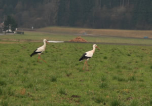 Här har vi haft besök av storken. Jag menar nu den riktiga storken. Jag har aldrig sett en stork i naturen, men igår stog två på åkern här utanför. Russin, som egentligen aldrig skäller utom kanske någon gång åt damsugaren, tyckte att det var något man kan skälla på. Det blev tre mycket djupa och dova skällningar sen var det helt ok att de stog där. Idag på morgonen var de båda storkarna på åkern precis vid huset. Vad stora de är!