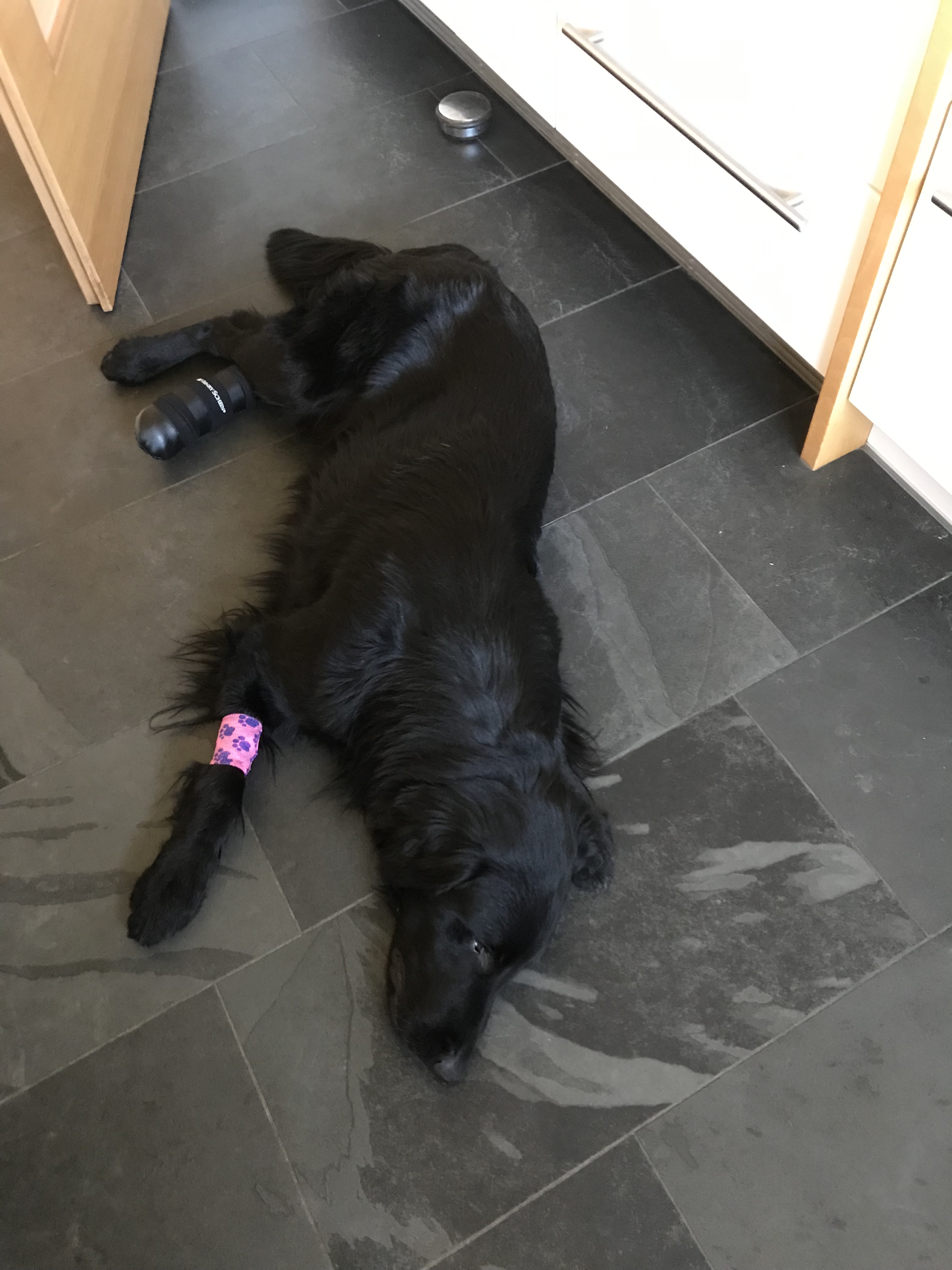Molnen blev svartare och svartare och blåsten kom. Eftersom alla redan var på plats och väderprognosen var riktigt dålig startade vi en timme tidigare. Tyvärr hjälpte det inte mycket . Gruppmomentet var visserligen utan regn, men när den första skulle in började det att ösregna. Så hade vi visserligen alla lika förutsättningar. Peppar och jag startade. Tävlingsledaren bar med sig apporten hela tiden och detta är något vi definitivt måste träna på. Peppar var väldigt fixerad på apporten under det fria följet och det gick alltså inget vidare – 6,5 p. Inkallandet 9,5 p, ställande under marsch 9,5, sättande under marsch 9,5, hopp över hinder 9,5, fjärren tyvärr bara 5 p för när jag lämnade Peppar satte han sig upp. Det var egentligen mitt fel eftersom jag inte gav ett extra kommando som jag brukar göra när jag går ifrån honom. Sändande runt en kon ? 0 han såg inte konen. Inte en aning om varför. Rutan 7 p, jag fick ge ett extra kommando och slutligen apporten som blev helt fel. Inte en aning om vad som hände, men händerna var dyblöta och apporten dessutom väldigt hal. Apporten gick rakt upp i luften och jag var glad att den inte träffade Peppar eller mig. Peppar reste sig med en gång och hämtade apporten som landade en halvmeter framför honom, tog sig ett varv och lämnade av. 0 p. Summan blev därmed 208,5 och ett tredje pris. Egentligen är jag riktigt nöjd. Två av felen gjorde jag och det blev dyrt. Jag är dock så glad över att vi äntligen kan starta på tävlingar och jag är övertygad om att vi kommer att visa upp vad vi kann så smångingom. Nästa tävling är den 1.6.