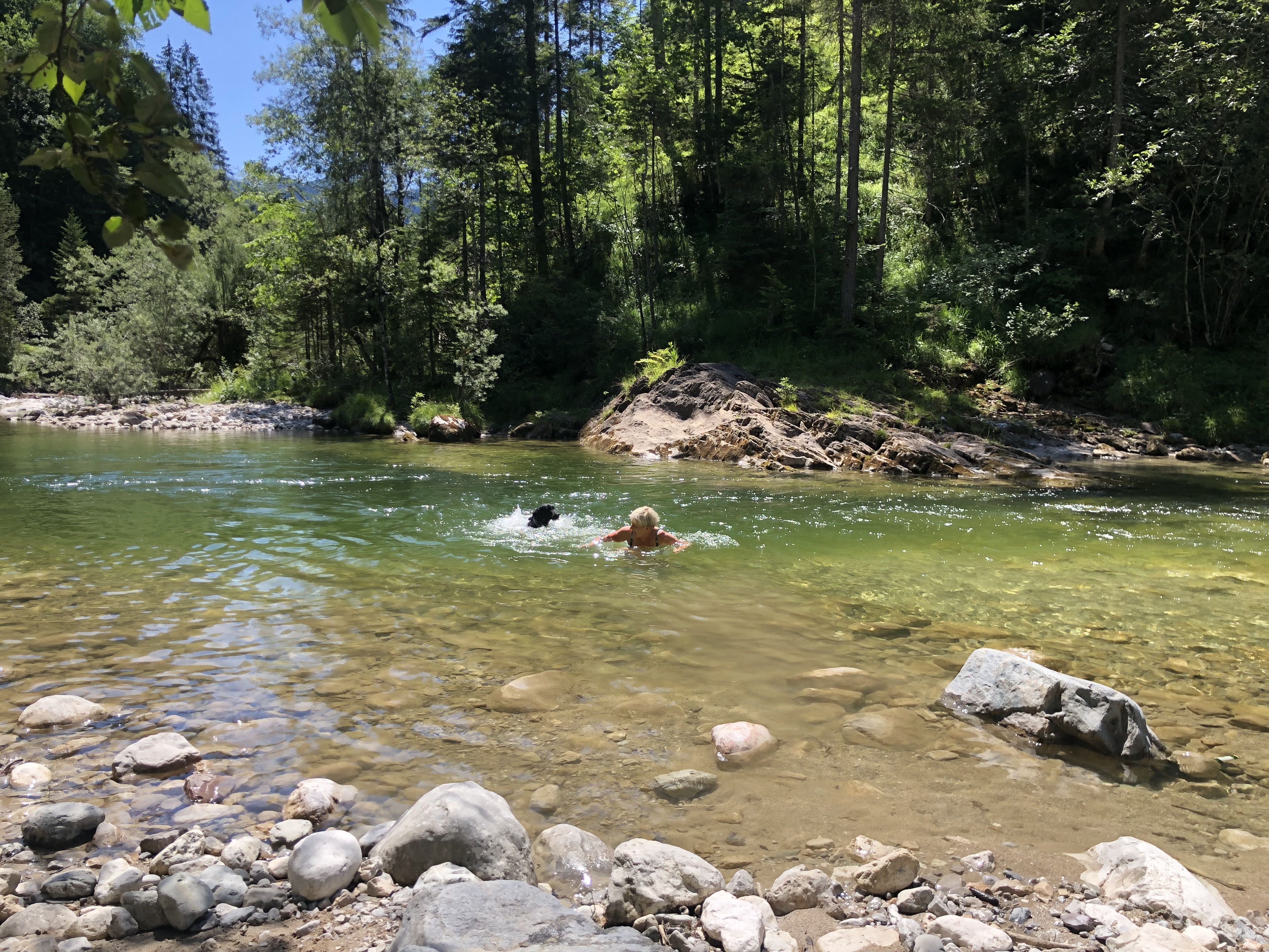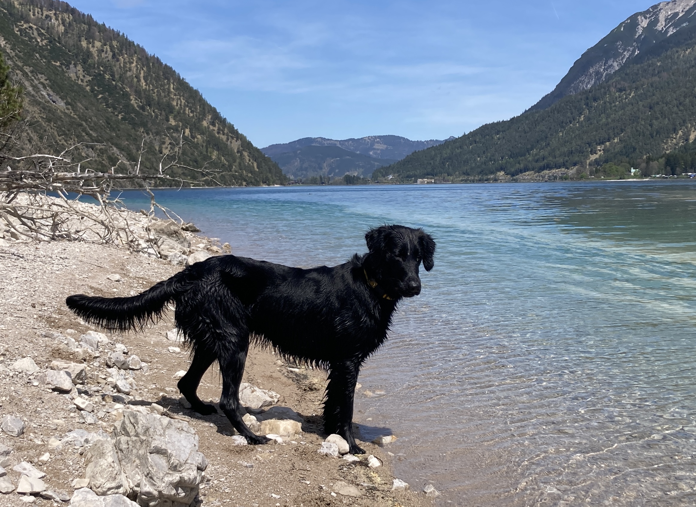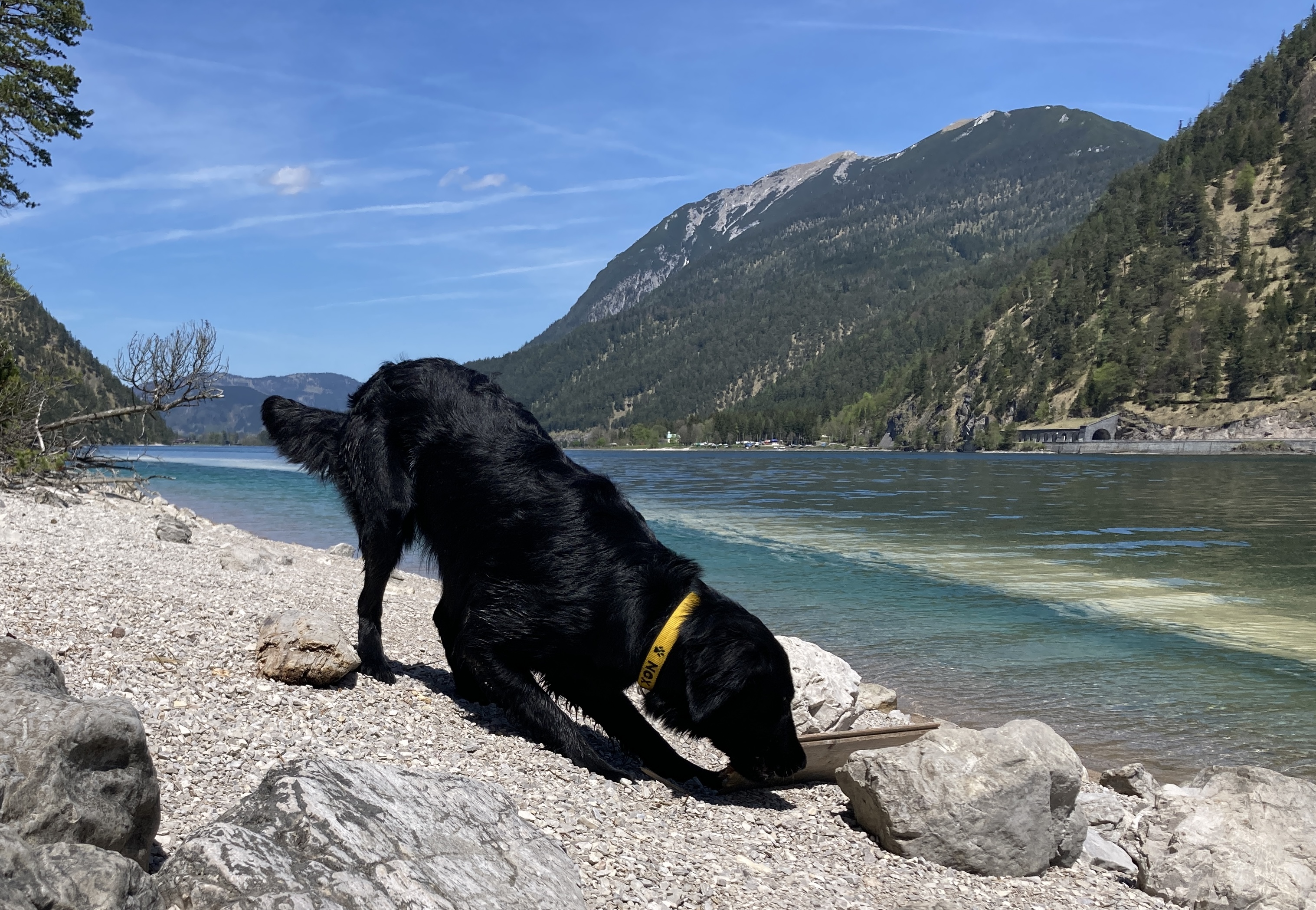 Idag körde Nox och jag iväg till Achensee. Ett riktigt sommarväder – 29° – är det idag, men för mig var sjön alldeles för kall (15°) för att göra årets första dopp. Nox tycker det är lite läskigt när han måste simma och ibland vågar han inte och ibland går det i alla fall. Han kanske också tycker det är för kallt, men vi får väl se om vi inte kan träna upp det lite.