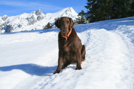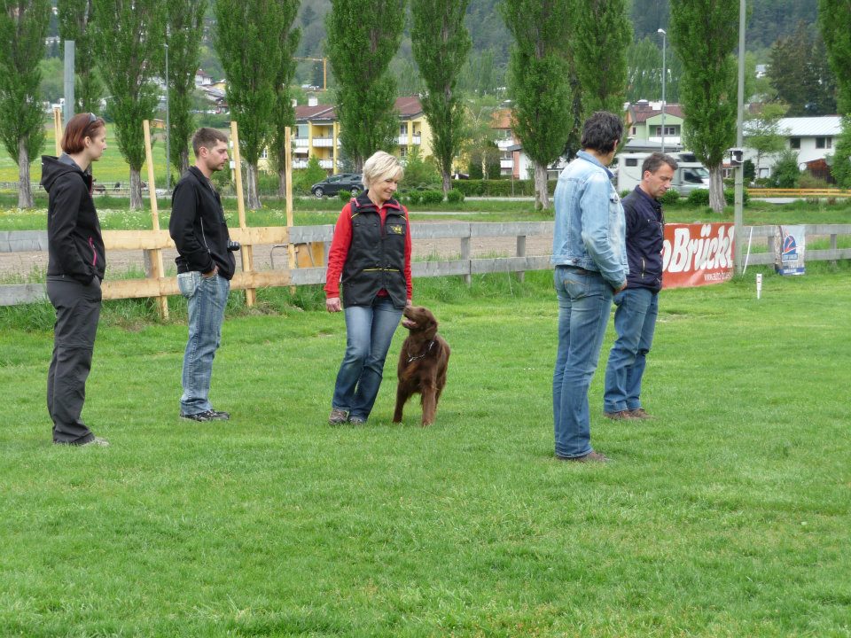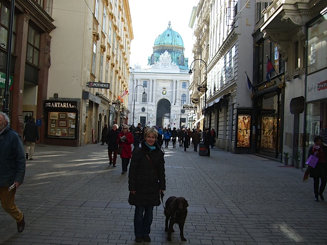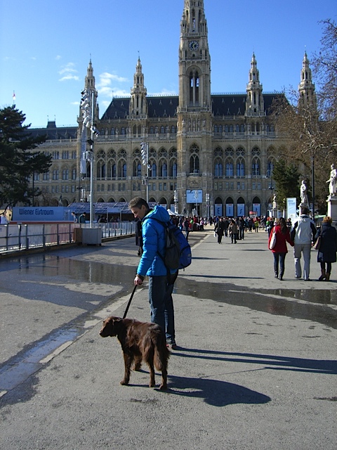 Vädret var fint, men det blåste ordentligt. Först blev det besök på Stefansplatz där vi naturligtvis tittade på Stefansdomen, en god Lunch på en trevlig liten resturang bredvid Peterskyrkan, sen blev det Hofburg, Volksgarten, Votivkyrkan, Neues Rathaus. Vi hann att se jättemycket, men naturligtvis det mesta bara utifrån eftersom vi inte kunde gå in med Russin. Det var fint ändå, men ansträngande. Det blev en dyr kopp kaffe på Cafe Lantmann och sen gick vi långsamt mot stationen igen. Tåget skulle gå kl 19:14. På väg till stationen träffade vi trevliga Barbara Aumann som är Flatcoatedretriever uppfödare här i Österrike. Hon kom med två flattar varav den ena var den dräktiga tiken Ally (ÖJCH ÖCH Ally McBeal Flat-XP) Det är spännande kull! Pappan till de kommande valparna är ”FTW Rondix Woodcock at Hawksthorn” och Ally har också en fin stamtavla. Om det är någon som är lite mer intresserad så är länken till hennes sida här: FLAT-XP Det var iaf väldigt roligt att träffas även om det naturligtvis blev väldigt kort. Sen tog vi alltså tåget hem och var hemma vid tolvsnåret och somnade tror jag med en gång!